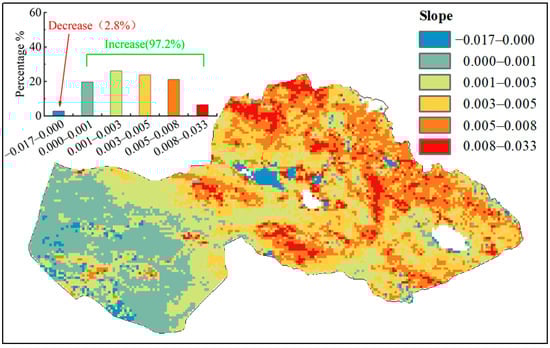 The multi-year mean values of GSN, ranging from 0.027 to 0.717, had obvious spatial heterogeneity and gradually decreased from northeast to southwest in the study area (Figure 4). The low values of GSN between 0 and 0.1 accounted for 17.0% of the total area and were mainly distributed in the western desert region; GSN between 0.1 and 0.2 had the highest proportion, about 40.0% of the total area, and the primary vegetation type was the desert steppe, which mainly distributed in the middle and southeast of the county; GSN over 0.2 were mainly distributed in the northeast of the county with a proportion of 42.6% of the total area. GSN changes in individual pixels over the study period were fitted by the method of ordinary least squares (Figure 5). The fitting slope ranged from −0.016 to 0.032, and decreased gradually from northeast to southwest as a whole; the area with GSN fitting slope greater than 0 accounted for 97.2% of the total, indicating that the vegetation covers of almost the whole county were in the process of improvement, even in the desert areas at the northwest of the county. The vegetation dynamics were divided into 6 changing patterns based on the fitting slope and significance (Figure 6), namely, Extremely significant increase (ESI, S l o p e > 0   and   p < 0.01 ), Significant increase (SI, S l o p e > 0   and   0.01 p < 0.05 ), Non-significant increase (NSI, S l o p e > 0   and   p 0.05 ), Non-significant decrease (NDI, S l o p e < 0   and   p 0.05 ), Significant decrease (SD, S l o p e < 0   and   0.01 p < 0.05 ), Extremely significant decrease (ESD, S l o p e < 0   and   p < 0.01 ). Approximately 53.9% of the total area showed ESI and 22.5% was SI from 2001 to 2020 and their corresponding pixels were evenly distributed throughout the county; for different vegetation types, about 80% of shrubland, steppe, and desert steppe were ESI and SI, while meadow and rest vegetation were about 50% and 60%, respectively.