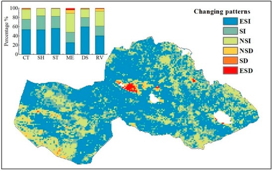 Figure 6. Changing patterns of the pixel growing season NDVI with years from 2001 to 2020. CT, SH, ST, ME, DS, and RV represent county, shrubland, steppe, meadow, desert steppe, and rest vegetation, respectively. ESI, SI, NSI, NDI, SD, and ESD represent Extremely significant increase, Significant increase, Non-significant increase, Non-significant decrease, Significant decrease, and Extremely significant decrease, respectively.