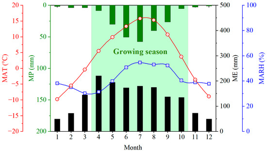 Figure 7. Monthly variations of climate factors. MAT, MP, ME, MARH represent Monthly average Temperature, Monthly Precipitation, Monthly Evaporation, and Monthly Average Relative Humidity, respectively.