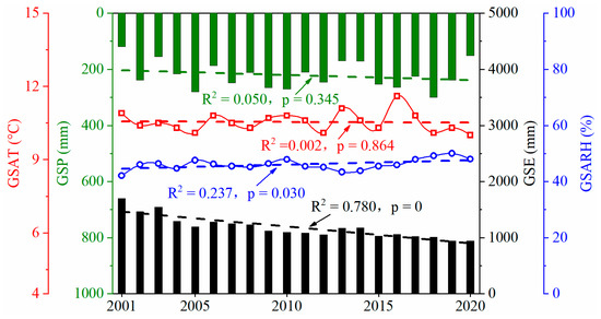 Figure 8. Interannual variation of growing season climate factors from 2001 to 2020. GSAT, GSP, GSE, GSARH represent Growing Season Average Temperature, Growing Season Precipitation, Growing Season Evaporation, and Growing Season Average Relative Humidity, respectively.