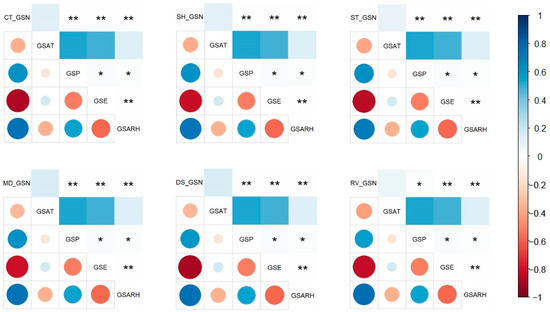 The Pearson’s correlation analysis illustrated high correlations among GSP, GSE, and GSARH, while low correlations between GSAT and other 3 climate factors; furthermore, GSN of the county and 5 vegetation types exhibited evident relationships with GSP, GSE, and GSARH (Figure 9). GSP showed a significant negative correlation with GSE ( r = 0.51 ,   p < 0.05 ), while a significant positive correlation with GSARH ( r = 0.54 ,   p < 0.05 ); and there was an extremely significant negative correlation between GSE and GSARH ( r = 0.58 ,   p < 0.01 ). This indicated that the climatic factors were mutually affected. As the above result that GSN of the county and different vegetation types had similar fluctuation process with years, GSN of the county and different vegetation types also had similar relationships with climate factors. GSN trends of the county and the 5 vegetation types had no obvious correlation with GSAT, extremely significant negative correlation with GSE ( 0.89 < r < 0.81 ,   p < 0.01 ), and extremely significant positive correlation with GSARH ( 0.71 < r < 0.76 ,   p < 0.01 ). For GSP, GSN trends of the county, shrubland, steppe, meadow, and desert steppe exhibited an extremely significant positive correlation with it ( 0.59 < r < 0.61 ,   p < 0.01 ), while that of rest vegetation was a significant positive correlation with it ( r = 0.56 ,   p < 0.05 ).