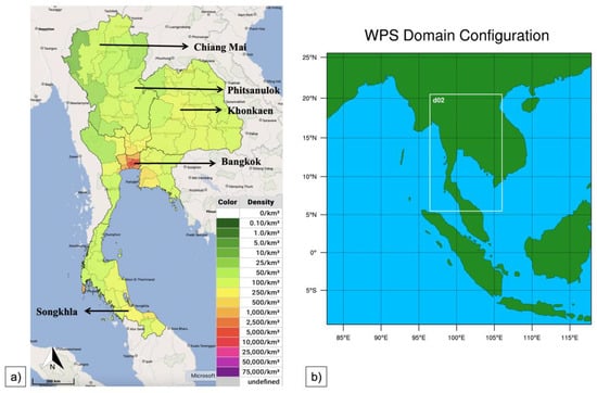 (a) Population in Thailand in year 2019 (available online: https://www.citypopulation.de/en/thailand/prov/admin/ (accessed on 27 January 2022)), (b) NRCM domain.