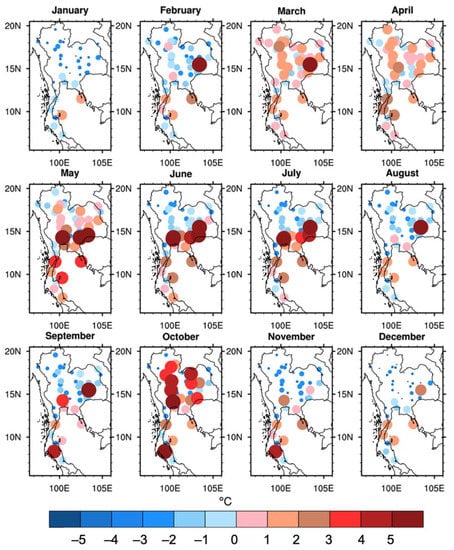 Figure 2 and Figure 3 show the validation of the difference in monthly mean temperature averaged over 1990–1999 between the model and the observations, based on 44 TMD stations’ locations. In general, the NRCM reasonably predicts the monthly temperature, relative humidity, and HI. The modeled temperature exhibits a cold bias in January–February and November–December, whereas relative humidity and HI are predicted to be lower throughout the year. When validated with ground-based TMD observations data, the spatial distribution of monthly mean relative humidity and 2 m temperature from the inner domain of the NRCM outputs is comparable and well predicted. Although the temperature of the NRCM was higher than that of the TMD by 2 °C–3 °C in most regions of Thailand, especially in March to May, a slight difference in the modeled temperature of −1 °C–−2 °C was found in Northern Thailand for the entire year. An overestimation of the modeled temperature was found in the central part of Thailand for an entire year in the range of 3 °C–5 °C. The HI prediction can be influenced by a temperature bias. Although the HI is affected by two factors—temperature and relative humidity—several studies show that temperature has a strong correlation with the heat index [19,54,55]. There was a lower HI estimation in Northern Thailand, while the higher temperature predicted in Central Thailand led to a higher HI value.