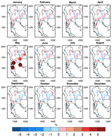 We compare the spatial distributions of present-day monthly-averaged HI to those of future HI for the single climate change scenario depicted in Figure 5. The HI increases during the rainy season, which includes June, July, and August (JJA), as well as September, October, and November (SON). Figure 5 compares the spatial distribution of the monthly average HI between 1990–1999 and 2020–2029. In general, HI analysis suggests a widespread increase in heat in the majority of Thailand. The statistically significant trend in the HI was geographically clustered in Thailand’s central and southern regions. The HI is projected to rise by 0.1 °C–4 °C throughout Thailand in the future, most notably in December. In January, the HI dropped marginally, by only 1.5 °C. In December, a dramatic rise was observed in Thailand’s central and southern regions; the HI increased by more than 4 °C in Central and Southern Thailand, while the temperature in other regions increased by around 2 °C.