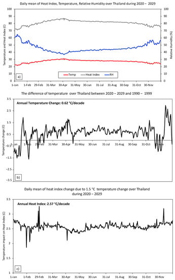Daily average of (a) heat index (gray line), temperature (red line), and relative humidity (blue line) during 2020–2029; (b) the difference in temperature between 2020–2029 and 1990–1999 over Thailand; (c) heat index change due to 1 °C temperature change during 2020–2029.