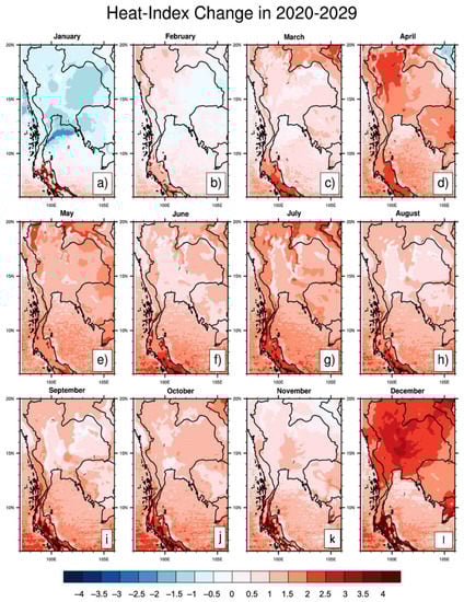Projected changes in decrements in monthly mean heat index in (a) January, (b) February, (c) March, (d) April, (e) May, (f) June, (g) July, (h) August, (i) September, (j) October, (k) November, (l) December.