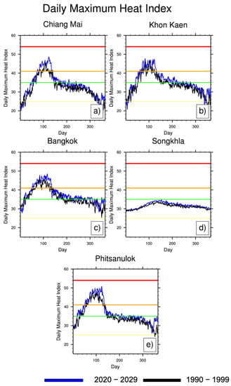 Daily maximum heat index during 2020–2029 and 1990–1999 in (a) Chiang Mai, (b) Khon Kaen, (c) Bangkok, (d) Songkhla, and (e) Phitsanulok with the levels of “caution” (yellow), “extreme caution” (green), “danger” (orange), and “extreme danger” (red) indicated.