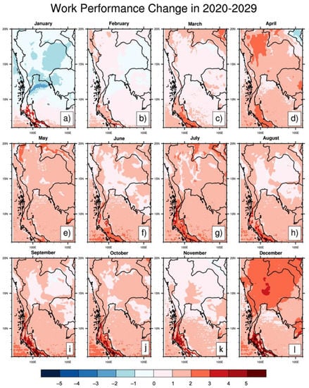 Figure 7 depicts the reduction in work performance caused by heat. The work performance decrement tends to increase throughout the year, with the exception of January, when there is a tendency to decrease in the range of (−4)% to (−2)% across Thailand. The maximum increase in the decrement in work performance is found in December, in the range of 4% to >10% across Thailand. When compared with other regions, Southern Thailand tends to face the maximum decrement in work performance in most areas. This is likely due to the topography effect in Southern Thailand, which is located near the ocean. As reported by Laîné et al. [76], the relative humidity from the CMIP5 data over the oceans increased by a modest amount. The results of work performance correspond to the change in HI, as shown in Figure 5. An increase in the HI caused a reduction in the work performance of employees working in hazardous conditions [77]. These results are similar to previous reports suggesting that heat stress is expected to exacerbate health risks and deplete labor force capability, especially in tropical and subtropical regions [78,79]. When we focused on five urban cities, namely Chiang Mai, Khonkaen, Bangkok, Songkhla, and Phitsanulok, the work performance tended to deteriorate noticeably for the years 2020–2029 (Figure 8). The future decrement in work performance tends to clearly increase by up to 50% during the summer months, especially in April, in all cities except Songkhla, where it will likely increase by up to 20%. The maximum decrement in work performance is found for Phitsanulok, reaching up to 50% throughout summertime. The exposure to heat for a brief period when working may exacerbate heat-related illness [80]. Along with adverse health consequences, this will have a detrimental effect on workplace productivity [81,82,83]. Cognitive exhaustion, difficulties with mental concentration, and decreased work performance because of the temperature increase could result in productivity losses [84]. Additionally, sweat evaporation ceases at higher relative humidity levels, impairing the body’s cooling ability and resulting in heat-related illness [82]. This result is similar to that of Dunne et al. [78], who proposed a fit for estimating labor ability and announced a decrease in labor work capacity of up to 40% in the tropical and mid-latitudes under the RCP8.5 scenario.