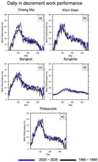 Daily mean decrements in work performance (%) during 1990–1999 and 2020–2029 in (a) Chiang Mai, (b) Khon Kaen, (c) Bangkok, (d) Songkhla, and (e) Phitsanulok.