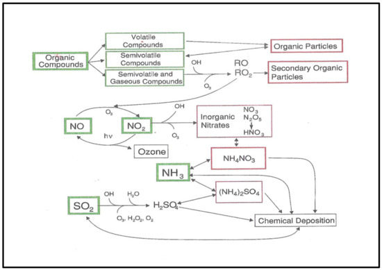 In most early studies of urban air chemistry, characteristic meteorological conditions were specified, while the influence of gaseous or particle pollution emissions were varied to seek control strategies for air quality improvement. Since the 1950s, the chemical mechanisms of reactive gas oxidation have been characterized in great detail [11,12]. Early on, urban air chemistry recognized the importance of an airborne particle (aerosol) component. Aerosols drive both from primary sources and from the oxidation of gases that link with gas phase chemistry [13]. Mechanisms for aerosol formation were predicated for inorganic components by the 1980s. However, knowledge of the complexities of organic aerosols has expanded dramatically since the 1990s [14,15].