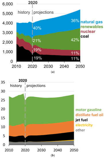 Much of urban chemistry is a consequence of contemporary energy resources, which are largely fossil carbon based. A major element of change in urban chemistry is projected to be linked with energy demand and apportionment by fuel sources. For illustration, the projected U.S. energy consumption for 2050 is shown in Figure 2. Despite the increasing pressure to reduce the dependence on fossil fuels, energy consumption tends to grow, especially with natural gas and renewables displacing coal and petroleum. A similar pattern is projected for world energy use [29]; the growth in consumption follows the projected world population increase and industrialization. However, the projected reduction in fossil fuel use may be accelerated with international commitments derived from conferences, such as the COP-26 in Glasgow, Scotland.