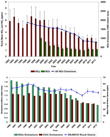 The long-term trends in ambient chemical indicators, such as the urban ozone, sulfur and nitrogen oxides, particle SO4 and NO3, and BC or OC, provide a chemistry baseline for projecting future conditions. The examples of ambient trends are shown in Figure 4 for the annual average concentrations of NOy, NOx, and O3 with emission trends (including VOC) for the states of Alabama, Georgia, Mississippi and northwest Florida. These data are obtained from the Southeastern Aerosol Research and Characterization Study (SEARCH) [40]. The declines include the cities of Atlanta and Birmingham. In the case shown in the Figure, there is a linear, approximately 1:1 proportional response of ambient concentrations to emission reductions, except for O3. This gas often shows a less than 1:1 proportionality to NOy, and an uncertain reduction relative to VOCs. This was observed in other locations, e.g., New York [53], as well. Across the United States, urban O3 vs. NOy trends also show proportionality [54]. In principle, the linear (or other) relationship for the ambient concentrations and reactant emissions can be adapted to project future conditions, if the emissions are the principal variation in the chemistry. Annual trends can be complemented with seasonal trends as well. For example, a shift in the seasonal O3 concentration maxima from summer towards the spring could suggest a change in chemistry.