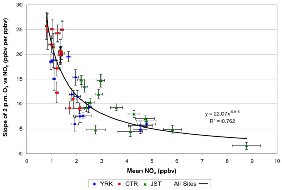 - Ninneman, M.; Demerjian, K.; Schwab, J. Ozone Production Efficiencies at Rural New York State Locations: Relationship to Oxides of Nitrogen Concentrations. J. Geophy. Res. Atmos. 2019, 124, 2363–2376. [Google Scholar] [CrossRef]