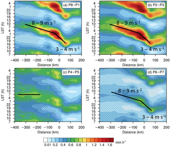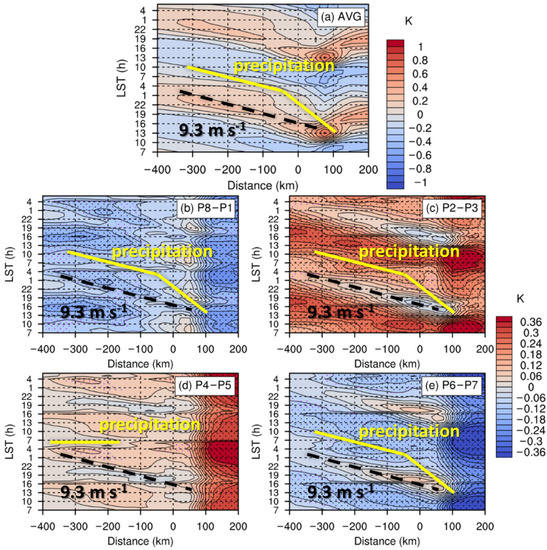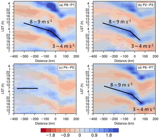 Figure 3 contains the Hovmöller diagrams of precipitation rates among different MJO phases. In general, the diurnal variation of coastal rainfall stands out with a daytime landside peak followed by a nighttime seaside peak. The diurnal amplitude varies among different MJO phases, as strongest in P2–P3 (Figure 3b) and weakest in P6–P7 (Figure 3d), similar to the findings from Fujita et al. [46]. The diurnal variation of rainfall is characterized by evident offshore propagation, relatively obscured in P4–P5 (Figure 3c). The landside rainfall begins around 1300 LST around 50 km onshore, and migrates offshore with a phase speed of 3–4 m s−1, until approximately ~30 km offshore around 0100 LST. Subsequently, the offshore propagation with a higher phase speed of 8–9 m s−1 occurs from ~30 km offshore to ~300 km offshore until ~1000 LST in the following day. In P4–P5, a diurnal phase-locking pattern with a maximum at ~0600 LST is found around −370–−160 km offshore.