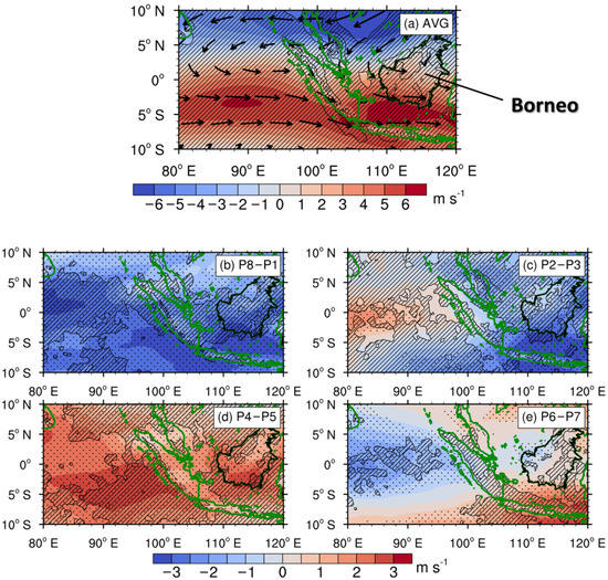The horizontal distributions of zonal wind (shaded, m s−1) and vertical motions (contour, 0.5 cm s−1) at 850 hPa (a) averaged in DJF 2011–2020 as well as its anomaly in (b) P8–P1, (c) P2–P3, (d) P4–P5 and (e) P6–P7. The black outline marks the island of Borneo. The diagonal lines indicate the positive (upward) averages or phase anomalies for vertical motions. The black dots indicate the 95% confidence according to the Student’s t-test.
