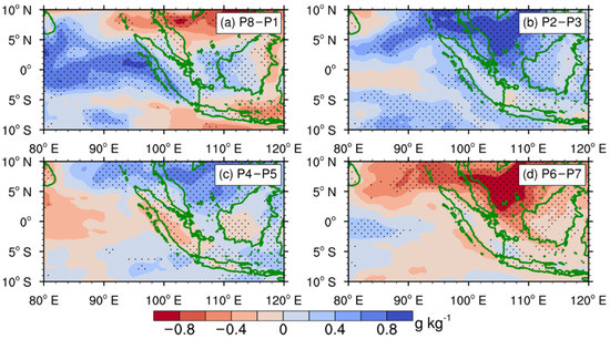 The anomalies of water vapor mixing ratio at 850 hPa (g kg−1) in (a) P8–P1, (b) P2–P3, (c) P4–P5 and (d) P6–P7. The black dots indicate the 95% confidence according to the Student’s t-test.