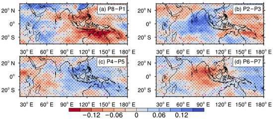 In contrast, P8–P1 and P4–P5 have both conducive and unconducive conditions affecting the convection. As shown in Figure 5b,d, the wind anomalies to the west and northeast of Sumatra are consistent, and result in relatively weaker convergence anomalies. The differences in the precipitation rate (higher in P8–P1 than in P4–P5) arise mostly from the upstream vapor anomalies at the northern Indian Ocean (Figure 6a,c).