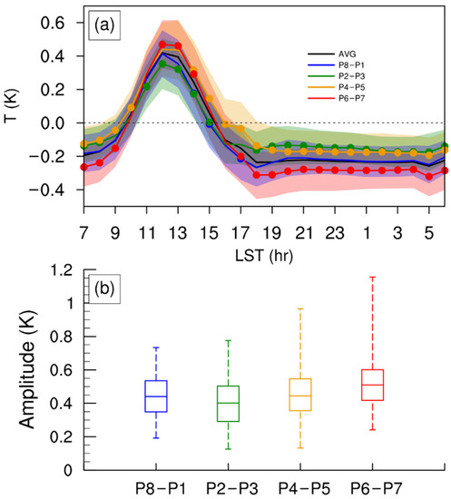 (a) The diurnal variations of 850-hPa land–sea temperature contrast (line, K) and its standard deviation (shaded, K) for total average and phase averages, calculated as the landside mean subtracted by seaside mean within 100 km from western Sumatra coast; (b) the box figures of diurnal amplitudes (K). The dots in Figure 8a indicate the 95% confidence according to the Student’s t-test.