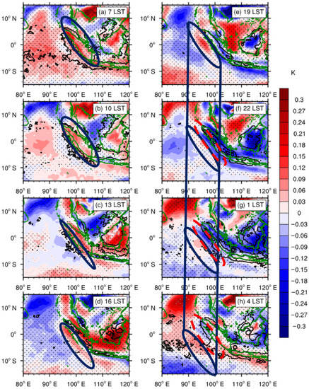 As shown in Figure 3 and Figure 4, the average phase speed of diurnal offshore precipitation propagation is 3–4 m s−1 near the coast, similar with the magnitudes in the land breeze or the cold pool outflow [28,30,32,61]. The phase speed of 8–9 m s−1 further offshore is noticeably distinguished from the magnitude of background wind, and indicates other possible factors such as gravity waves, with a similar speed of roughly 8–15 m s−1, as generated by land–sea thermal contrast or convection [21,24,62,63,64,65]. The mechanism of this quicker propagation affecting the diurnal rainfall farther offshore will be explored in this section. Figure 10 shows the diurnal signals of offshore propagation in 700-hPa temperature by subtracting the spatial mean from the temporal deviations. The wavelike bands of positive signals (solid ellipses) and negative signals (dashed ellipses) parallel to the western Sumatra coast reflects the influences of the coastline as well as the coastal mountains on the temperature variations, similar with the findings from Ruppert and Zhang [66] as a horizontal view of geography-affected gravity wave activities. The landside positive band develops and is separated from the coast since 0700 LST; afterwards, it moves offshore and gradually dissipates to around 0700 LST the following day. The offshore migration speed from 1900 LST to 0400 LST is estimated to be about 9.7 m s−1, similar to the magnitude of the precipitation migration from 0100 LST to 0700 LST which exhibits a phase lag of approximately 6 h. The landside rainfall is evident since 1600 LST, after the strong thermal convection and the cloud formation around 1300 LST. The offshore migration of rainfall begins at 2200 LST when the thermal disturbance moves offshore, and this migration sustains until 1000 LST in the next day, similar to the beginning and ending of the migration exhibited in Figure 3 and Figure 4.