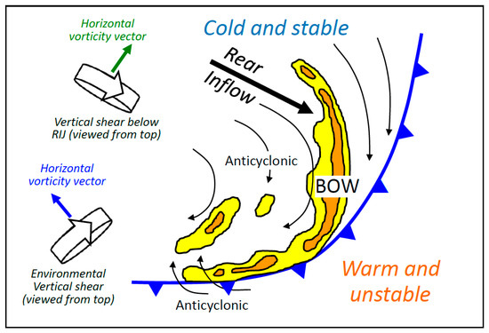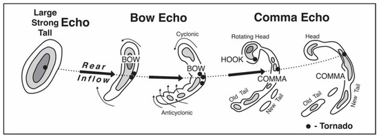 - Weisman, M.L.; Trapp, R.J. Low-level mesovortices within squall lines and bow echoes. Part I: Overview and dependence on environmental shear. Mon. Weather Rev. 2003, 131, 2779–2803. [Google Scholar] [CrossRef][Green Version]