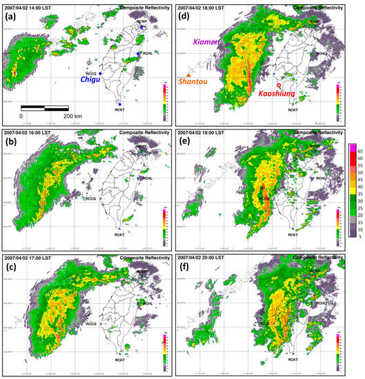- Wang, C.-C.; Hsu, J.C.-S.; Chen, G.T.-J.; Lee, D.-I. A study of two propagating heavy-rainfall episodes near Taiwan during SoWMEX/TiMREX IOP-8 in June 2008. Part I: Synoptic evolution, episode propagation, and model control simulation. Mon. Weather Rev. 2014, 142, 2619–2643. [Google Scholar] [CrossRef]