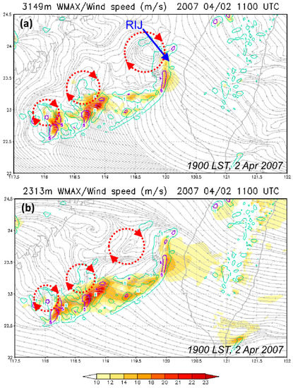 - Wang, C.-C.; Chen, G.T.-J.; Chen, T.-C.; Tsuboki, K. A numerical study on the effects of Taiwan topography on a convective line during the Mei-yu season. Mon. Weather Rev. 2005, 133, 3217–3242. [Google Scholar] [CrossRef]
