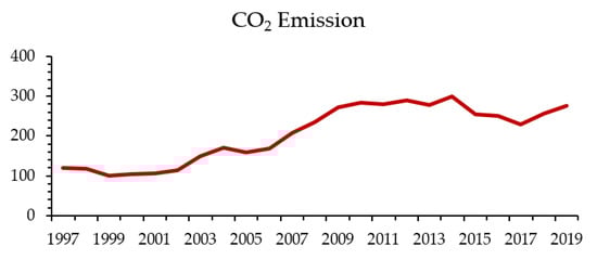 In 2018, China’s total cereal output was about 148.5 million tons, with a total planting area of 30,190 hectares, making China the world’s largest cereal producer, accounting for about 28% of the global cereal output [,,]. With the intensification of climate change, China’s cereal yield may decline by 20%–36% in the next 20–80 years [,]. In most provinces of China, abnormal changes in temperature and rainfall often hinder the development of food crops, resulting in a decline in average grain yield [,]. Sichuan province is a major agricultural province and the only major grain producing province in the West region of China. In 2018, the grain output of Sichuan province reached 34.937 million tons, including 14.786 million tons of cereal, 2.473 million tons of wheat and 10.663 million tons of corn. The cereal planting area has stabilized in recent years, the wheat planting area has decreased by nearly half in recent ten years, while the corn planting area has decreased by nearly half. In general, cereal is the most important food crop in Sichuan province, regardless of planting area or total output. The climate of Sichuan province has fluctuated in recent years, generally showing the characteristics of higher temperature and less rain, and this is also the adverse result caused by the annual increase in CO2 emission in Sichuan province in recent years. The historical trend of CO2 emission in Sichuan province is displayed in Figure 1. In the context of rising CO2 emissions, according to the 2019 Sichuan climate bulletin published by Sichuan Climate Center, it is pointed out that the average temperature of Sichuan province in 2019 is 15.4 °C, 0.5 °C higher than that of the whole year, ranking the ninth highest in the history. At the same time, there is less precipitation in seven months of the year, which reflects the uneven distribution of rainfall in Sichuan province. Agriculture is a highly sensitive sector to global warming. Extreme weather events, such as floods and drought, have an adverse effect on agricultural production. Therefore, changing climate will exacerbate food production [,,,].