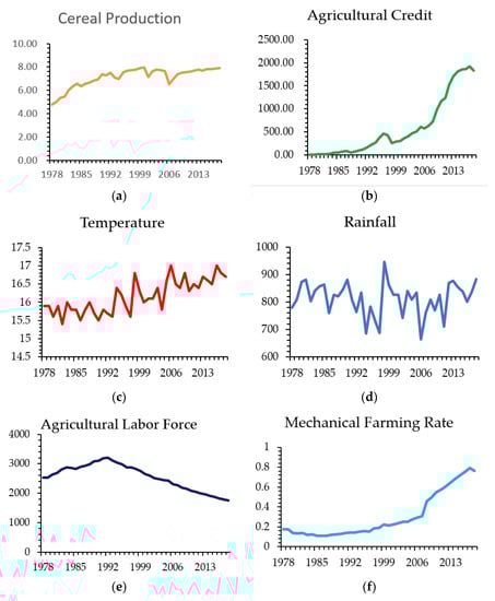 In the context of China, several studies have been conducted to examine the impacts of climate change on agricultural production, for example, Pickson et al. (2020) assessed the effects of global warming on cereals production, Pickson et al. (2021) also explored the nexus between changing climate and rice productivity, Chandio et al. (2019) studied the influences of climate factors on agricultural output, and Chandio et al. (2020) examined the impacts of financial development on agricultural productivity [,,,]. However, these studies ignored some main factors of cereals production, such as agricultural credit, and technical progress (i.e., mechanical farming rate). Furthermore, to the best of the authors’ knowledge, the present study attempts to contribute to the existing literature by investigating the impacts of climatical factors on cereal production using co-integration analysis with the auto-regressive distributed lag (ARDL) bounds testing approach. Conclusively, there was no study focusing on the province-based estimation of impacts of climate change on cereal production, using the time series datasets. This study also incorporates other important factors, including agricultural credit and the mechanical farming rate, which were ignored by previous studies. The present study addresses the following research questions: