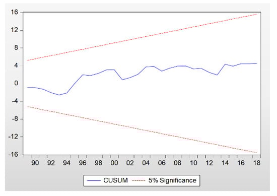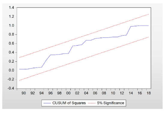 For the robustness test of the ARDL model, the CUSUM and CUSUM of the squares testing methods are adopted in this investigation. The testing results are shown in Figure 3 and Figure 4. It can be seen that the broken line formed by the CUSUM and CUSUM of the square does not exceed the boundary under the 5% significance level, and then it can be concluded that the ARDL model in this study is stable.