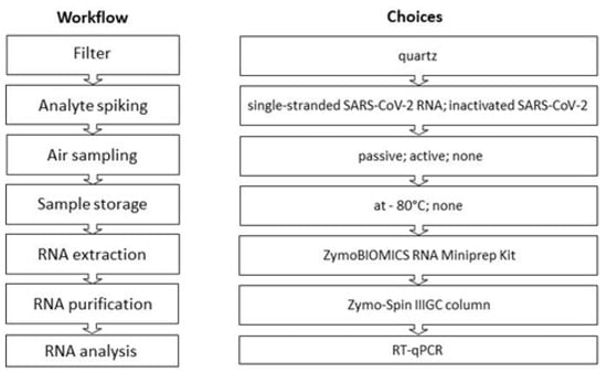 In brief, quartz fiber filters were spiked with the analyte (standard single-stranded SARS-CoV-2 RNA or inactivated SARS-CoV-2 virions), subjected to air sampling, stored, and finally, the RNA was extracted from samples, purified, and analyzed. The workflow detail and the considered options for each step are reported in Figure 1.