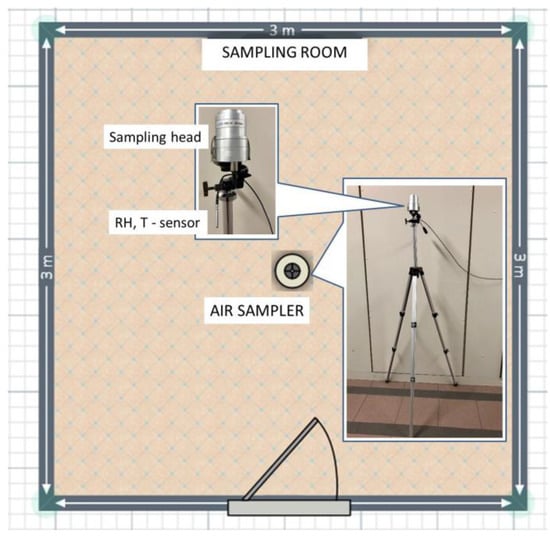 Five filters were preserved as blanks and not subjected to any sampling procedure. They were immediately stored in a closed, sterilized Petri dish after the spotting procedure. For details on the storage, see Section 2.3 The other filters were not preserved before sampling; they were used immediately after the spotting procedure. Six filters were placed in a PM10 sampling device (SILENT Air Sampler, FAI, Rome, Italy) with a nominal flow of 10 l/min for 24 h (active sampling). Four filters were left in an open Petri dish close to the sampling apparatus for the same time period (passive sampling). The active and passive sampling procedures were carried out in a 3 × 3 m room, as shown in Figure 3, in the absence of people. The room was isolated from the general air conditioning system of the academic department hosting the experimentation.