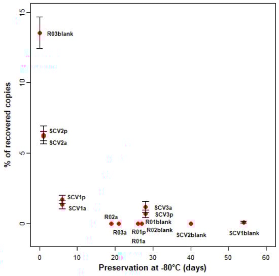 Percentage of recovered copies of SARS-CoV-2 RNA in relation to the number of preservation days at −80 °C.