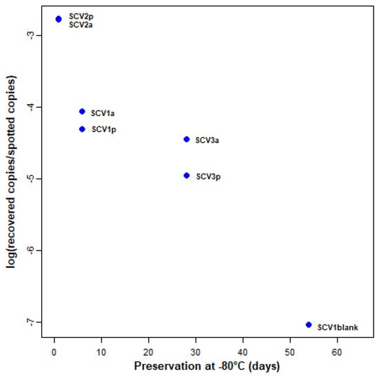 Logarithm of the recovered copies and spotted copies ratio of SARS-CoV-2 RNA in relation to the number of preservation days at −80 °C.