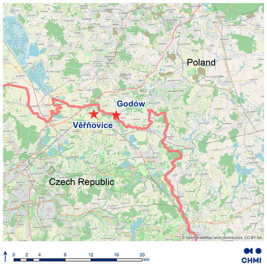 Two stations located close to the Czech–Polish border were selected for evaluation (Figure 1 and Figure 2). The Czech station Věřňovice [28] is a station of the Czech Hydrometeorological Institute (CHMI) and is located at an altitude of 203 m less than 800 m from the state border with Poland. The Polish station Godów [29] is a station of the Chief Inspectorate of Environmental Protection (GIOŚ, Poland) and is located at 204 m less than 500 m from the state border with the Czech Republic. The monitored sites are about 3.5 km apart in a straight line, in the west–east axis. Both sites belong to the National Air Quality Monitoring Network of Czech republic [30] and Poland. At the Věřňovice station, pollutants and meteorological variables are measured in an automatic programme (1-h data). Godów is a manual station (24-h data). The data from the Věřňovice station were supplied by the Czech Hydrometeorological Institute for this processing. Data from the Godów station are managed by the Chief Inspectorate of Environmental Protection (GIOŚ) and are available on their website (https://powietrze.gios.gov.pl/pjp/archives, accessed on 10 January 2022). The evaluation includes 1-h concentrations of suspended PM10, temperature and wind direction and speed from the Věřňovice station, and 24-h concentrations of PM10 from the Godów station. Benzo[a]pyrene concentrations could only be included in the assessment from the Věřňovice station and the year 2020, when measurements were taken every 6th day. In other years, no BaP measurements were carried out in Věřňovice. Although BaP was measured at Godów for the entire assessment period 2011–2020, it could not be fully included in the treatment. Daily BaP concentrations are not related to a specific measurement day but are budgeted for each day of the week (Monday to Sunday). One concentration is therefore available for the whole week (Monday to Sunday), but it does not have an identifier for which day it was measured (https://powietrze.gios.gov.pl/pjp/archives, accessed on 10 January 2022). Annual BaP concentrations can be calculated, but daily concentrations cannot be evaluated in relation to other variables, e.g., wind direction and wind speed. The measurements of meteorological variables at the Věřňovice station are representative of the wider area [28], and, therefore, the wind direction and wind speed (or temperature) data can be used for the Godów station. The processing period is 2011 to 2020 with the limitations described above.