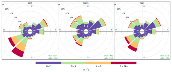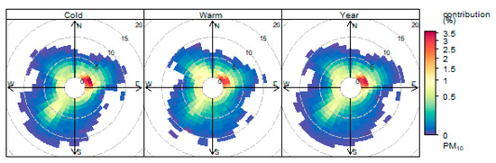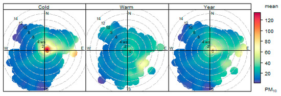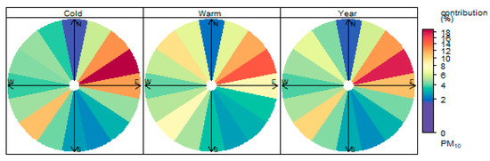 In the analysis, concentration roses were also used for illustrative purposes, which show average PM10 concentrations for the given wind direction and speed, as well as weighted concentration roses [32]. The difference between a concentration rose and a weighted concentration rose is that the latter provides information about how often a given wind direction and speed combination occurs and states to what extent the concentrations detected for a given wind speed and direction affect the overall average concentration for a given period. The comparison of the two roses may show a significant pollution source located, however, in a sector from which the wind only rarely blows and thus does not contribute significantly to the overall average concentration. The concentration rose reveals what the pollution situation was at maximum concentrations of a given contaminant at a particular site; the weighted concentration rose shows from what wind direction and at what speed the pollution came to the largest extent for the whole period. For the above-described reasons, both rose types for the same site and period may vary significantly [33]. In the presented roses, there is information about calm air, which is a situation with a wind speed of 0–0.2 m∙s−1.