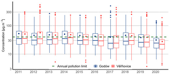 Boxplot of daily PM10 concentrations, Godów and Věřňovice stations, 2011–2020 (blue and red squares indicate average concentrations).