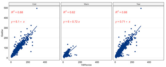 To assess the dependences of the behaviour of concentrations at the stations Věřňovice and Godów, it was possible to use (see the description in Section 2) only daily concentrations of PM10 for the period 2011 to 2020. The results in Figure 5 show a significant correlation dependence between the compared stations. The summer season (R2 = 0.62) shows the least favourable results, the dependence for cold seasons (R2 = 0.88) is significantly better.