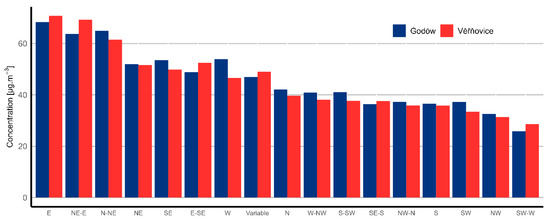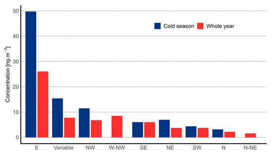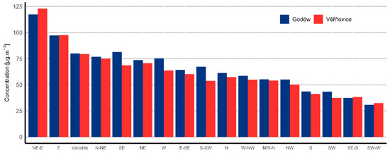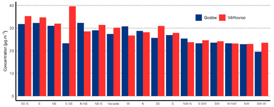 For the assessment of 24-h pollutant concentrations depending on wind direction, the internal methodology of the CHMI for determining the daily type of wind direction was used. The methodology determines the daily prevailing wind direction, which is calculated from hourly wind direction and wind speed data, and at least 18 values must be available on a given day. Based on the methodology, it is possible to identify 8 basic directions N, NE, NW, W, S, SW, E, SE (North, North-East, North-West, West, South, South-West, East, South-East), or sectors for two directions located next to each other (N–SW, N–SW, N–SW, N–SW, N–SW, N–SW, NW–W), as well as for no wind (≤0.4 m∙s−1), variable wind and daily type of wind, which could not be specified (variable). The assessment of pollutant concentrations as a function of daily type of wind may not be objective. For example, for BaP at the Věřňovice site, measurements were not made every day. Measurements every 6th day do not objectively include situations with different occurrences of daily benzo[a]pyrene concentrations during the year (either with high or low concentrations), nor is it possible to include the occurrence of all types of meteorological conditions. This is an indicative characteristic with limited predictive value.