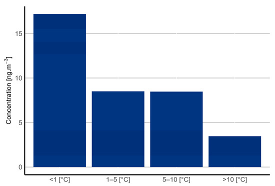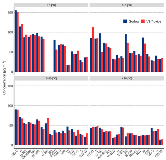 The dependence of PM10 concentrations on temperature is significant [38,39]. Figure 12 shows the PM10 concentrations as a function of temperature and divided into individual daily types of wind. At low temperatures below 1 °C, the highest PM10 concentrations (averaging more than 150 µg∙m−3) are obtained in the NE–E wind direction. At temperatures of 1–5 °C the influence of the E, SE and W directions is evident. At temperatures above 10 °C, the contribution of wind directions to PM10 concentrations is more balanced, with the lowest concentrations at SW–W.