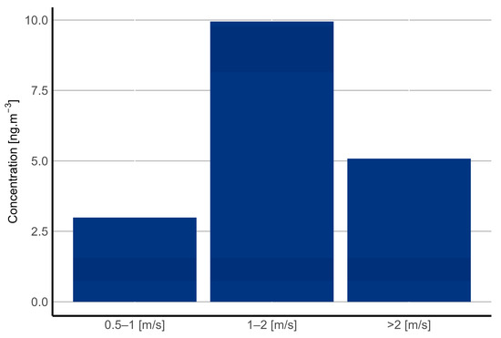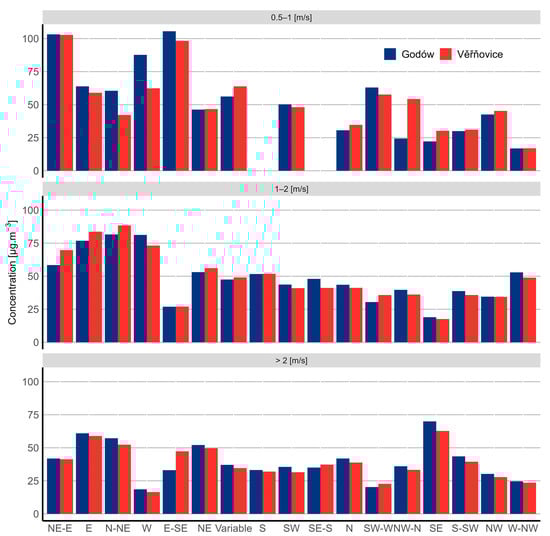 The dependence of PM10 concentrations on wind speed is significant [38,39]. Figure 13 shows the PM10 concentrations as a function of wind speed and divided into individual daily types of wind. At low wind speeds of 0.5–1 m∙s−1, the highest average PM10 concentrations (around 100 µg∙m−3) are achieved in the E–SE and NE–E daily types of wind. At wind speeds of 1–2 m∙s−1, the highest average PM10 concentrations are found at N–NE, E and W, and at wind speeds above 2 m∙s−1 at the SE wind direction.