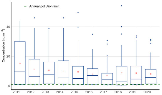 Boxplot of daily benzo[a]pyrene concentrations: Godów station, 2011–2020 (red squares indicate average concentrations; dashed line indicates the annual limit value for BaP).