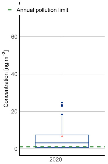 - European Council. Directive 2004/107/EC of the European Parliament and of the Council of 15 December 2004 Relating to Arsenic, Cadmium, Mercury, Nickel and Polycyclic Aromatic Hydrocarbons in Ambient Air; EC: Brussel, Belgium, 2005. [Google Scholar]