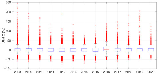 The annual distributions of the DfoF2 estimates obtained over European locations for each year of the considered time period (i.e., 2008–2020) in a box plot format. The box has lines at the lower quartile, median (red line), and upper quartile values. Whiskers extend from each end of the box to the adjacent values in the data; in our case, to the most extreme values within 1.5 times of the interquartile range from the ends of the box. Outliers (e.g., data with values beyond the ends of the whiskers) are presented by red crosses.