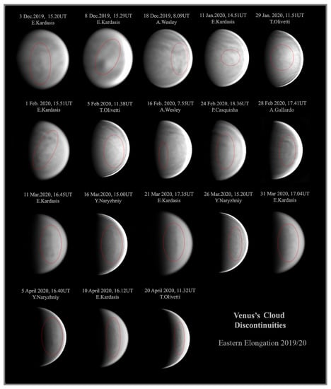 To study the CD events, we inspected the amateur observations of Venus hosted in the database of ALPO-Japan  http://alpo-j.sakura.ne.jp/indexE.htm (accessed on 5 February 2021) []. We selected and examined 458 NIR and 552 UV observations of the eastern elongation 2019/2020. The NIR observations were obtained with filters in the range 685–1050 nm and the UV observations with filters in the ∼320–410 nm range. Table 1 provides details about these NIR and UV observations as well as the Venus phase angle and the nominal best resolution. The resolution of the amateur images ranged from 187 to 663 km depending on the apparent angular size of Venus and the best resolution allowed by the diameter of the telescope  []. One of us (EK), on 11 March 2020 (with Venus having a solar elongation of 45.6 East,  in diameter, and 58% of illuminated disk), identified a strong manifestation of a CD and alerted Venus observers and researchers. That event stimulated intense monitoring and led to the current work. We inspected a period covering from 13 October 2019 to 25 April 2020 (Solar Elongation 16.2–40.8 East, angular size 10.3–35.8, illuminated fraction 0.962–0.295).