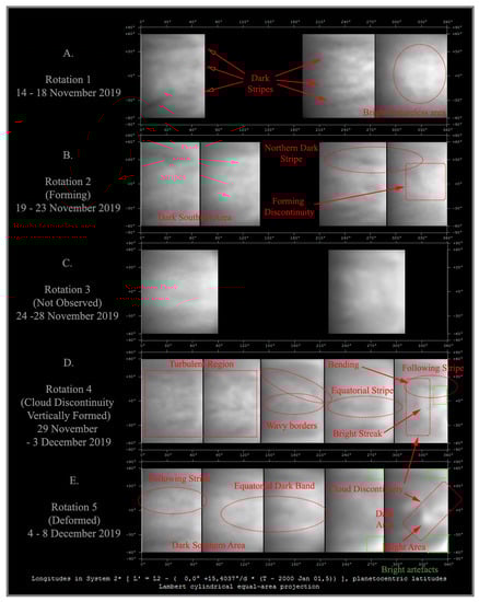 The first clear manifestation of CD occurred in late November 2019 (Figure 1 and Figure 2). On 18 November 2019, Venus displayed no features on the area where we would expect to observe the CD. There are three dark stripes or bands (Northern, Equatorial, Southern) in the proceeding area. On 23 November 2019, the CD seems apparent as an extension of the Northern Dark Stripe, which was previously reported as a cloud pattern frequently preceding the arrival of the discontinuity on the dayside middle clouds during the year 2016 [] (see Figure 1b). On 3 December 2019, the CD is observed between 26 N and 28 S, bending at its northern end and eastward extending ∼5700 km as an horizontal sharp dark stripe similar to those reported by Peralta et al. [] on the nightside lower clouds. On the west of CD, an equatorial stripe was formed also. In the central image of Figure 2D, a bright equatorial area is observed, surrounded north and south with wavy borders.