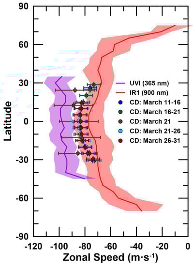 Zonal speeds of the clouds’ discontinuity (CD) during March 2020 (dots) compared with the zonally-averaged profiles of the zonal wind for the top of the upper clouds at ∼70 km (violet line) and the middle clouds within 50–55 km [] (red line). The speeds of the discontinuity and the winds at the cloud tops were obtained from ground-based near-infrared images and Akatsuki/UVI 365 nm images respectively, considering observations matching the CD events: 11, 16, 21, 26, and 31 March 2020. For the winds at the middle clouds, we considered the profile obtained by Peralta et al. [] during 2016. As a result of the worse spatial resolution at higher latitudes, speed vectors had larger error bars (errors of about  for t∼6 h and  for t∼5 terrestrial days).