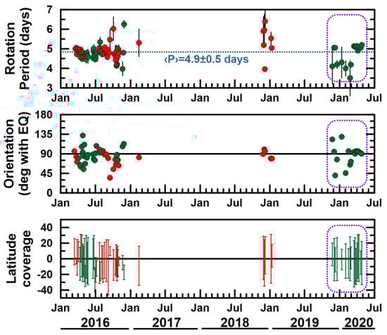 Long-term evolution of CD properties. Combination of past (2016–2018) with current (2019–2020) measurements (marked with the purple outline). The rotation period, orientation, and latitude coverage of the disruption along 2016–2020 are exhibited. The periods were measured from the position of the disruption at the equator in images separated by hours and several days. When the CD did not intersect the equator, we considered its longitude closest to the equator. The mean period is shown with a blue dotted line. Day and night-side data are shown in green and red, respectively.
