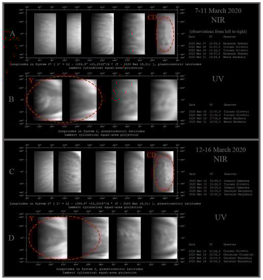Figure 5 and Figure 6 display a comparison between the morphology of the cloud tops (UV images) and the middle clouds (NIR images) during some of the CD events occurring in March 2020. The cycle of the discontinuity at the dayside middle clouds is confronted by that of the Y-feature at the cloud tops in Figure 5, using NIR and UV images obtained by ground-based observers and time composites similar to those published by Sánchez-Lavega et al. []. When comparing the cycles of 7–11 March and 12–16 March 2020, we observe that the position of the sharp vertical streak-form of the CD (evident in NIR images) does not seem linked to the propagation of the Y-feature in UV images or to any specific cloud pattern in its cycle. The time composites also display an evident phase-lag between both phenomena, supporting that we may be observing independent waves that propagate at different vertical levels.