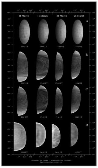 The first step in the analysis was to properly define the navigation of each image, i.e., the correct orientation (north–south), fitting of the limb, and the phase of the planet to a synthetic outline (calculated by software’s ephemeris). For this, and further processing of the images, we used the free software WinJupos  (http://www.grischa-hahn.homepage.t-online.de, accessed on 10 February 2021) []. We also used this software to measure the motions of clouds patterns (latitude–longitude position, size, and wind speed). The phase and the ephemeris of the planet are automatically calculated by the software. Two rotation periods are implemented in WinJupos for the determination of the planet longitudes: System 1 (S1) accounting for the surface rotation with a period of ∼243 days, and System 2 (S2) with a period of 4.2 days, corresponding to the superrotating upper clouds in UV images []. For creating maps of the dayside middle clouds with NIR images, we used a slower rotation rate with a period of almost 5 days (calculated from the average equatorial speed of CD events, see Table 2). CD speeds were measured using feature tracking of the following wave-front edge (FWFE henceforth) in pairs of images (with time separation ranging from a few hours to some days).