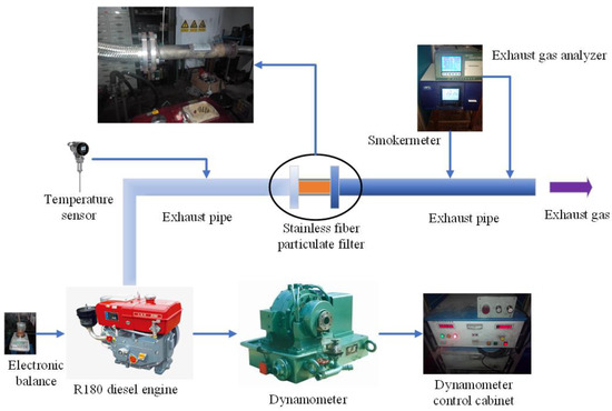 Schematic diagrams of the test bench are shown in Figure 1 and Figure 2. The bench comprises a dynamometer, diesel engine, particulate filter, electronic balance, temperature measuring instrument, gas analyzer and smoke meter. The diesel engine (Changchai R180, Changchai Co., Ltd., Changzhou, China shown in Table 1) is connected to the dynamometer. The dynamometer (CW50, CAMA Electromechanic Co., Ltd., Luoyang, China) is employed to measure the speed and torque of the diesel engine under different operating conditions. The electronic balance (LT500B, Tianliang Instrument Co., Ltd., Changshu, China) is employed to measure the fuel consumption. The gas analyzer (FGA-4100, Foshan Analytical Instrument Co., Ltd., Foshan, China) measures the HC, CO, NO, and CO2 volume percentages in the exhaust gas. The temperature measuring instrument applies a K-type thermocouple to measure the exhaust temperature, and a stainless steel fiber particle filter is implemented to collect PM. The smoke meter (AVL DiSmoke 4000, AVL List GmbH, Graz, Austria) is employed to detect the PM content. Table 2 lists the eight settings of the diesel engine at different speeds in the experiment.